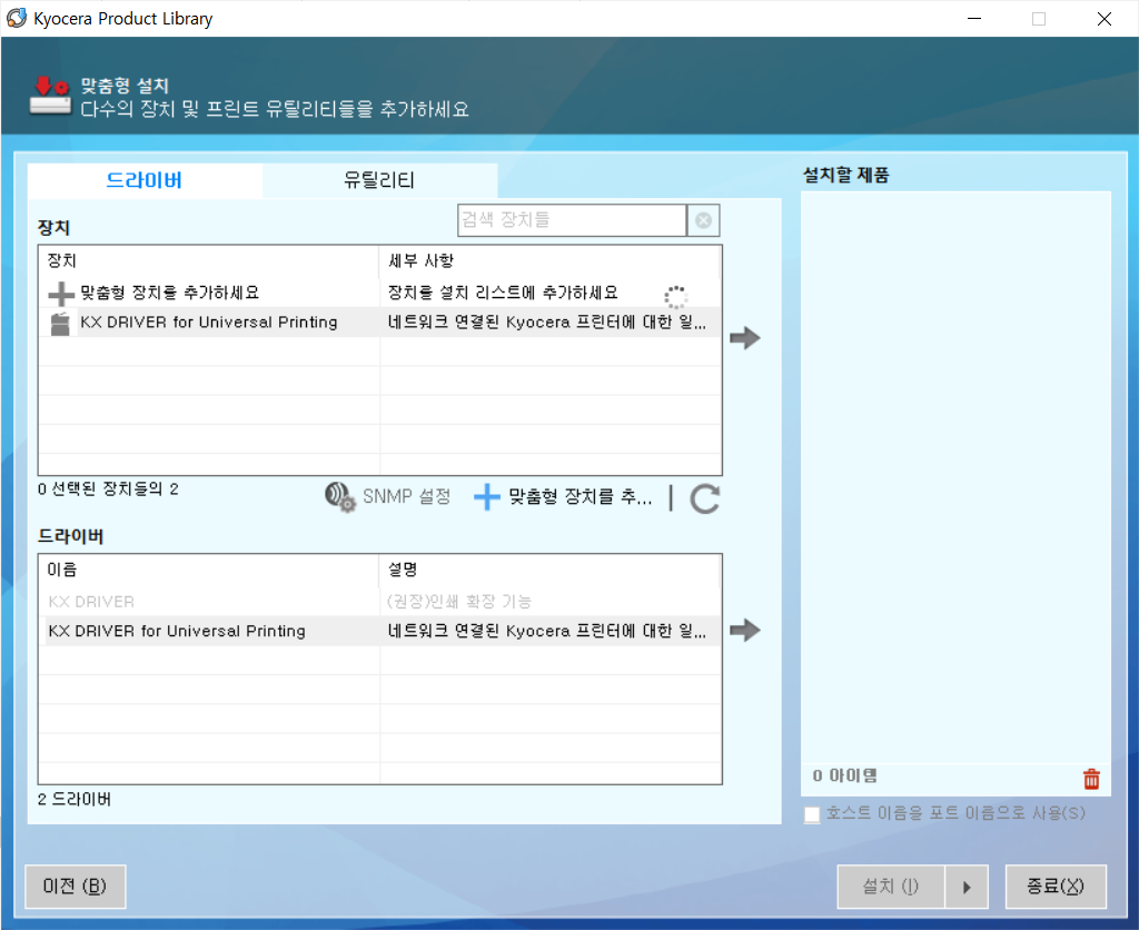 교세라 프린터가 같은 허브 OR 스위치에 연결되어 있으면 자동 설치를 통해서 쉽게 설치 가능하지만,