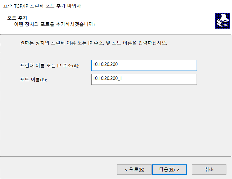 7. 다음을 클릭하고 프린터 IP 주소를 입력하여 주세요. 포트 이름은 자동으로 입력도 되고 이름 변경도 가능합니다.