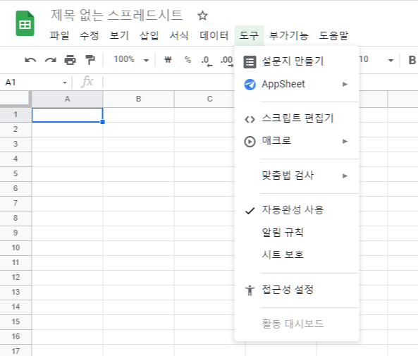 - 구글 스프레드시트 상단 메뉴바에서 도구 텝을 선택합니다.